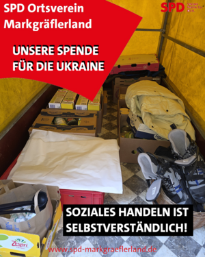 Der Vorsitzende des SPD Ortsverein Markgräflerland, Hartmut Hitschler, hatte seine Mitglieder wieder zu einer Geldspende für die Ukraine aufgerufen. Die Mitglieder haben so viel gespendet, dass er sehr viel von den Dingen kaufen konnte, die dringend benötigt werden. Das sind u.a. Babynahrung, Hygieneartikel, Waschmittel, Konserven. Zahnpasta, Zahnbürsten und Zahnseide musste der Vorsitzende nicht mehr kaufen, denn auf dem Landesparteitag in Ulm hatte er von der anwesenden Zahnärztekammer, auf seine Bitte, zwei große Pakete mit Zahnpasta, Zahnbürsten und Zahnseide erhalten.