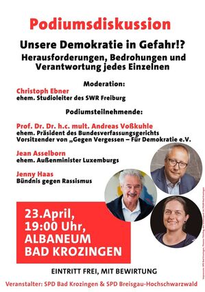 Wir möchten mit dieser Veranstaltung den Ist-Zustand aufzeigen, die Meta Ebene mit dem Staatsrechtler Vosskuhle beleuchten. Für die Erfahrungen in Europa und der Welt steht der mit 19 Jahren dienstälteste ehemalige Außenminister Asselborn parat und Jenny Haas wird uns einen Einblick geben, was wir alle mit bürgerschaftlichem Engagement tun können.